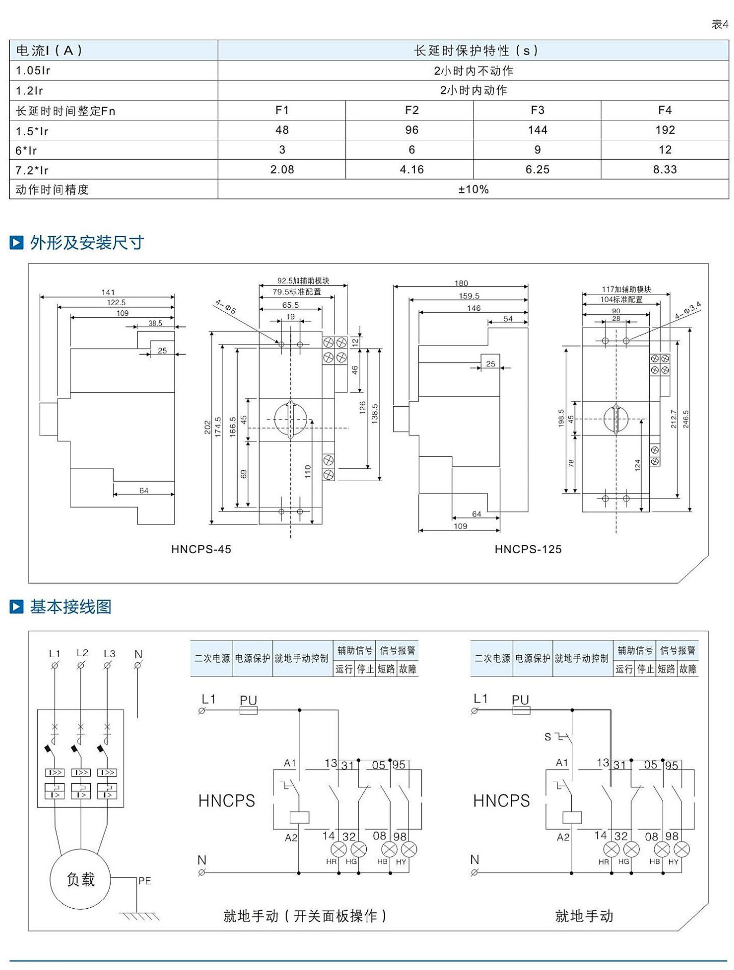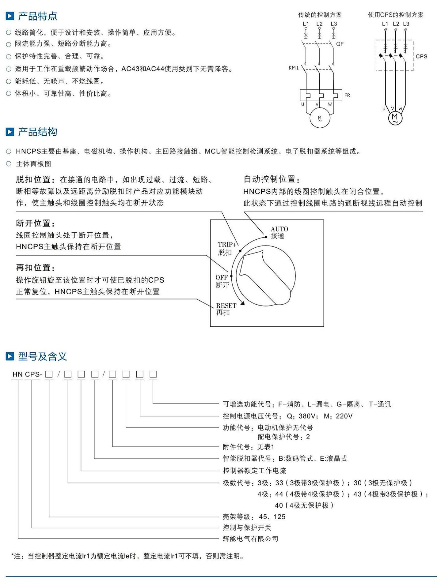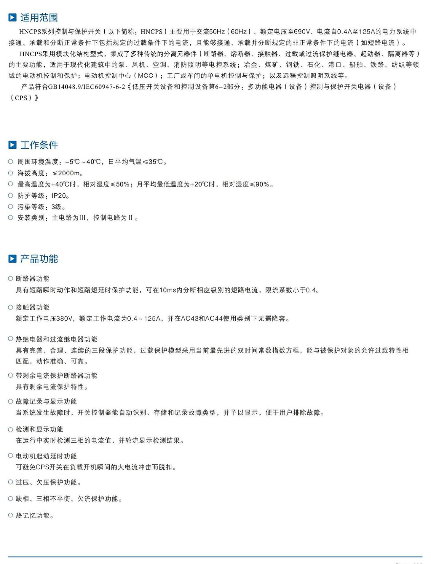 HNCPS系列控制与保护开关(以下简称:HNCPS)主要用于交流50Hz(60Hz)、额定电压至690V、电流自0.4A至125A的电力系统中接通、承载和分断正常条件下包括规定的过载条件下的电流,且能够接通、承载并分断规定的非正常条件下的电流(如短路电流)。
