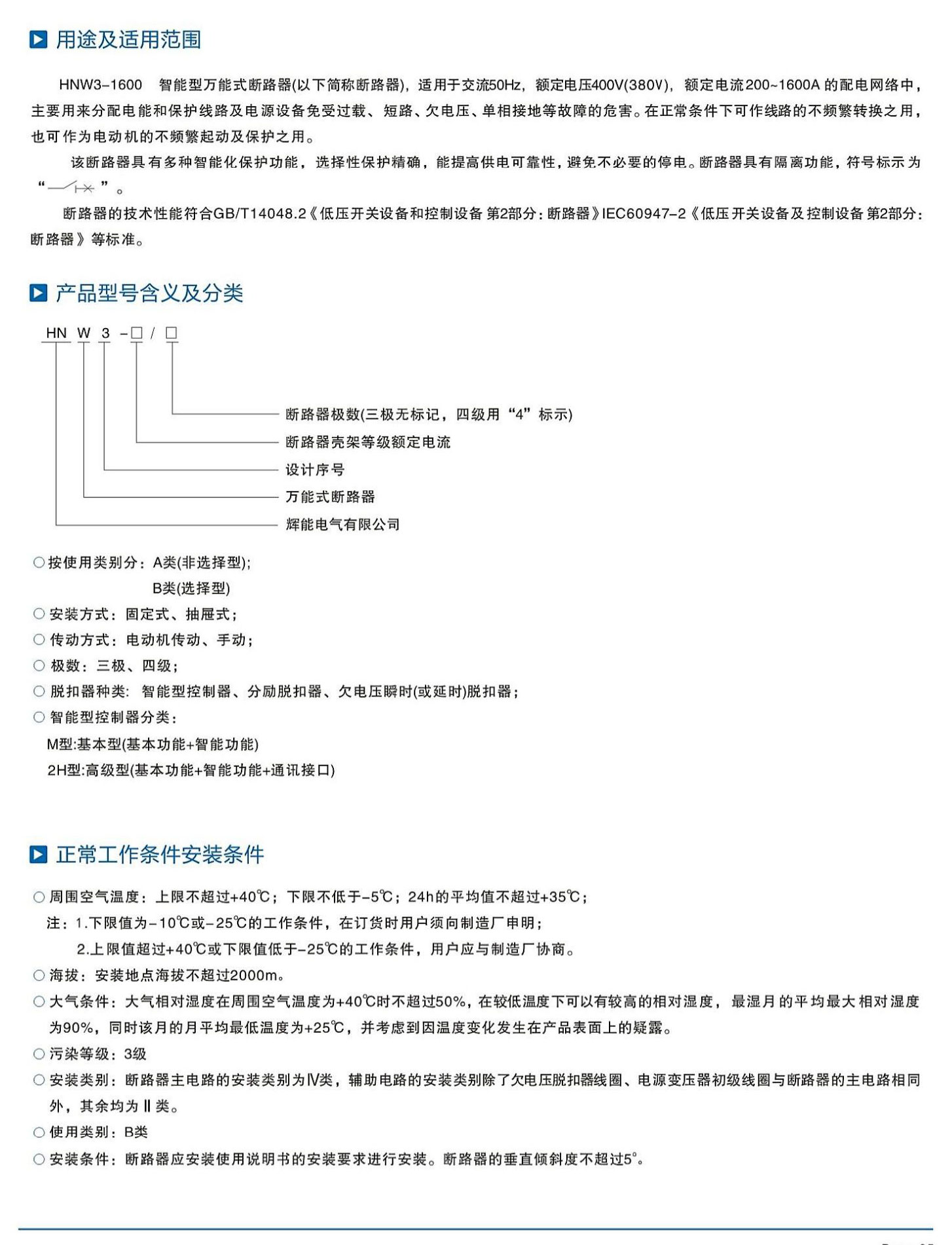 HNW3-1600智能型万能式断路器(以下简称断路器),适用于交流50Hz,额定电压400V(380V),额定电流200~1600A的配电网络中,主要用来分配电能和保护线路及电源设备免受过载、短路、欠电压、单相接地等故障的危害。在正常条件下可作线路的不频繁转换之用,也可作为电动机的不频繁起动及保护之用。